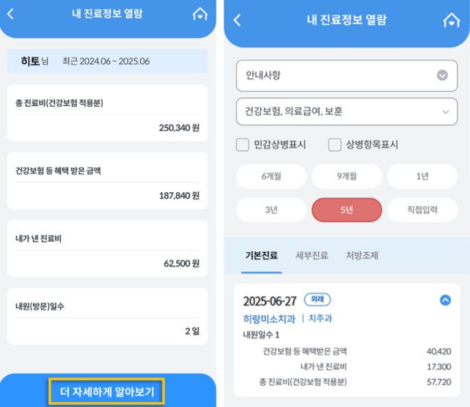 더 자세히 알아보기를 터치한 뒤, 조회하고 싶은 기간을 설정하면 해당 기간의 기본 진료내역, 세부 진료정보, 처방·조제 정보 등