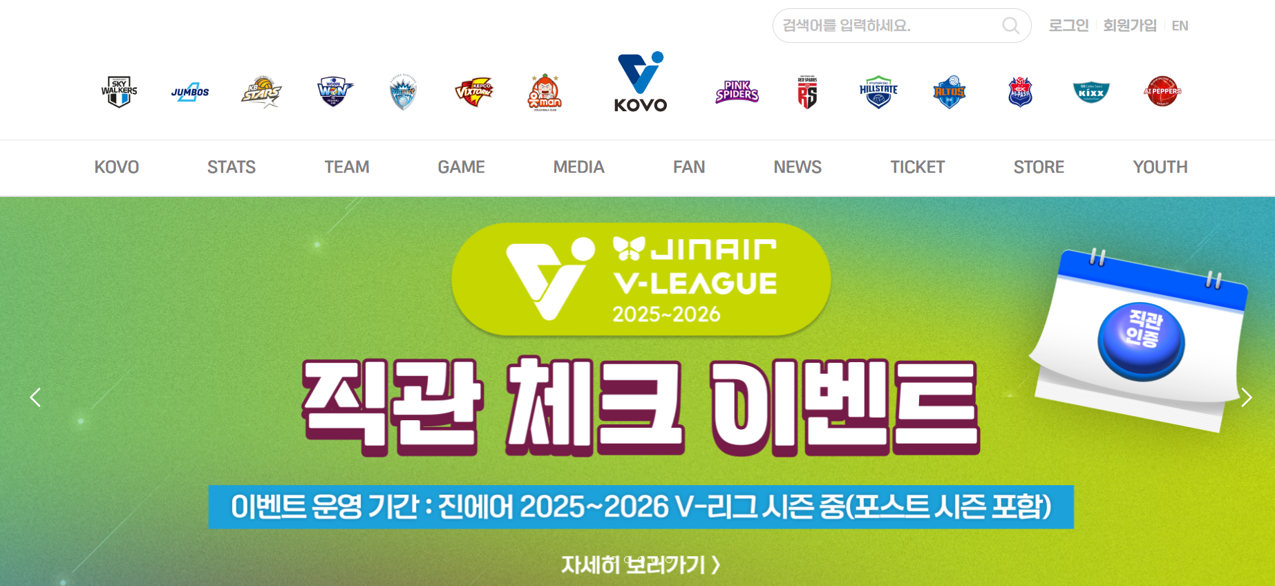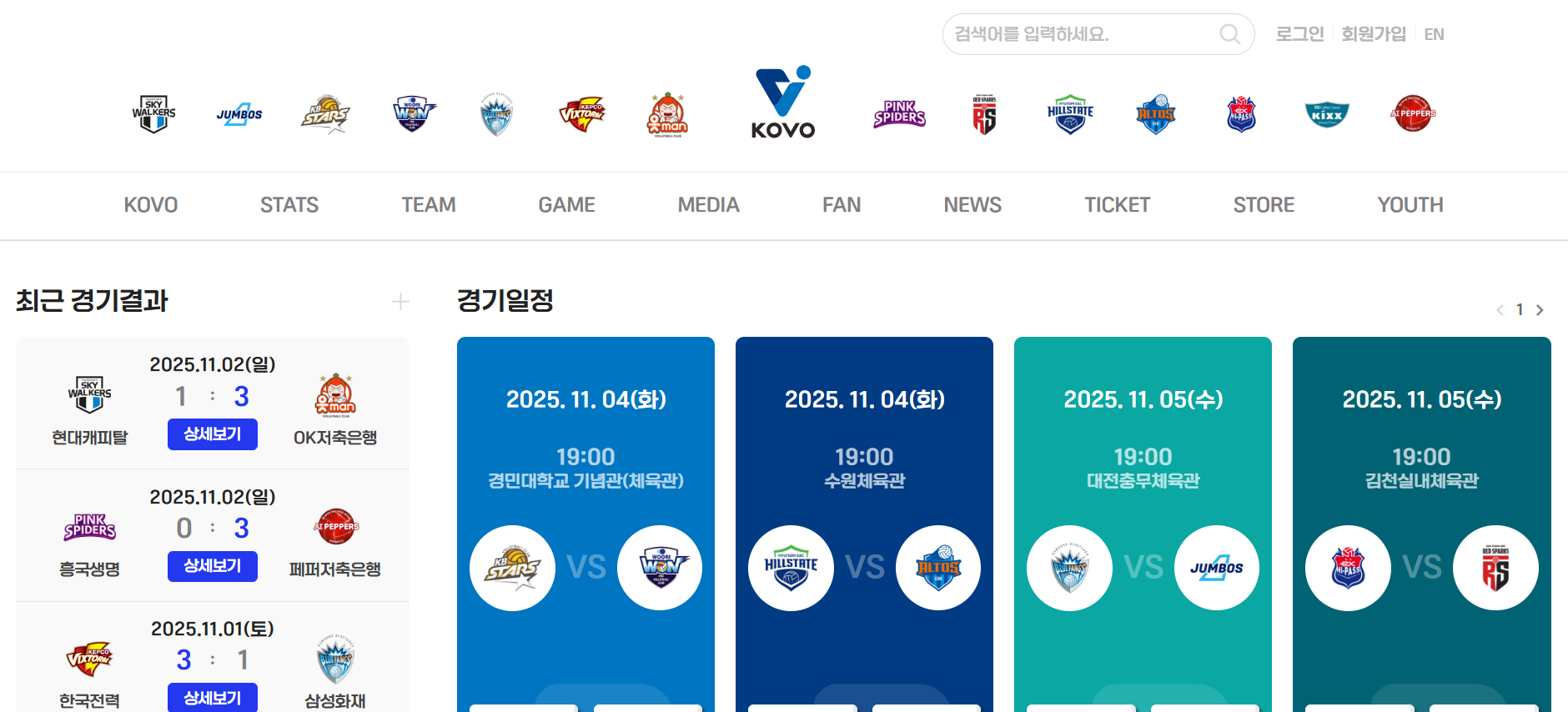kovo 공식 통합티켓예매처 홈페이지에 접속하면 V-리그 및 14개 구단 경기 입장권을 통합으로 예매할 수 있습니다. 예매는 PC 웹과 모바일 앱 또는 모바일 웹에서 진행 가능하며, 원하는 경기와 좌석을 선택할 수 있습니다.